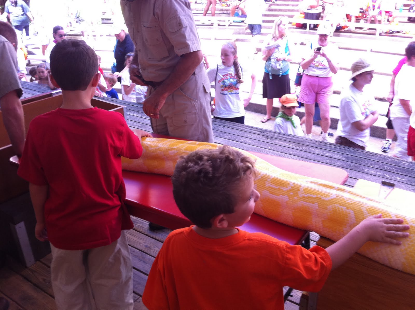 The boys also touched the snake.  You'll notice they are both dressed and have shoes.  Well, maybe you won't "notice" the shoes from the picture, but they did.  If their sister would sleep at night so that she wasn't getting dragged out of bed in the morning, maybe she'd be cute, too.  The cutest part of this experience was the herptologist showing a python shedding and saying "If you ever found one of these in your backyard, you should call me." Savannah, with a totally serious look, turned to me and said in the most concerned voice "We need his phone number!"